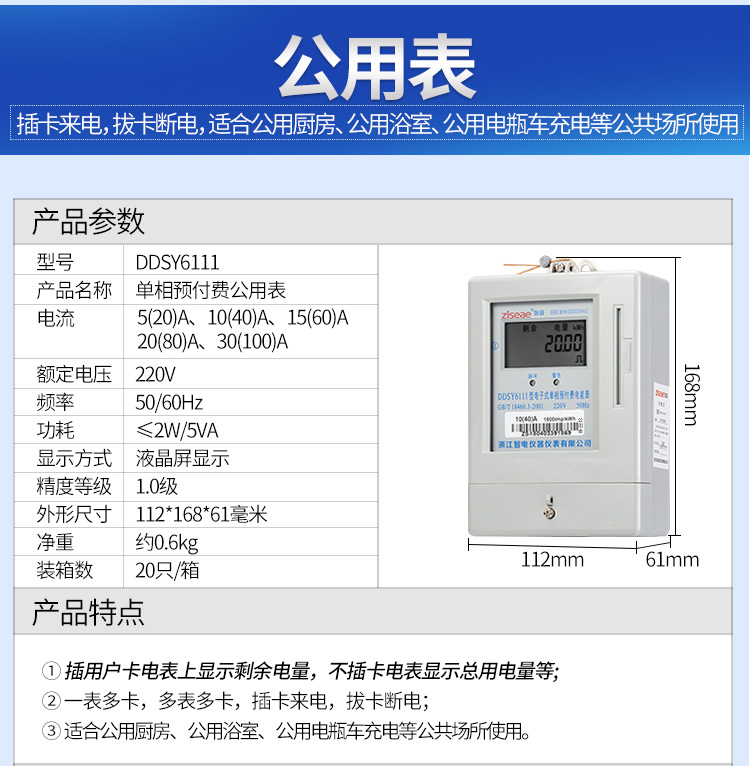 主要特點:應用計算機管理,先購電后用電;在額定電流范圍內能限制使用功率(由供電部門限定);一表一卡,專卡專用,失卡不失電,補卡再用;電卡能雙向傳遞數據,能自動斷電告警用戶購電;電量為零時,自動拉閘斷電;并具有一定的防竊電軟件設計等。