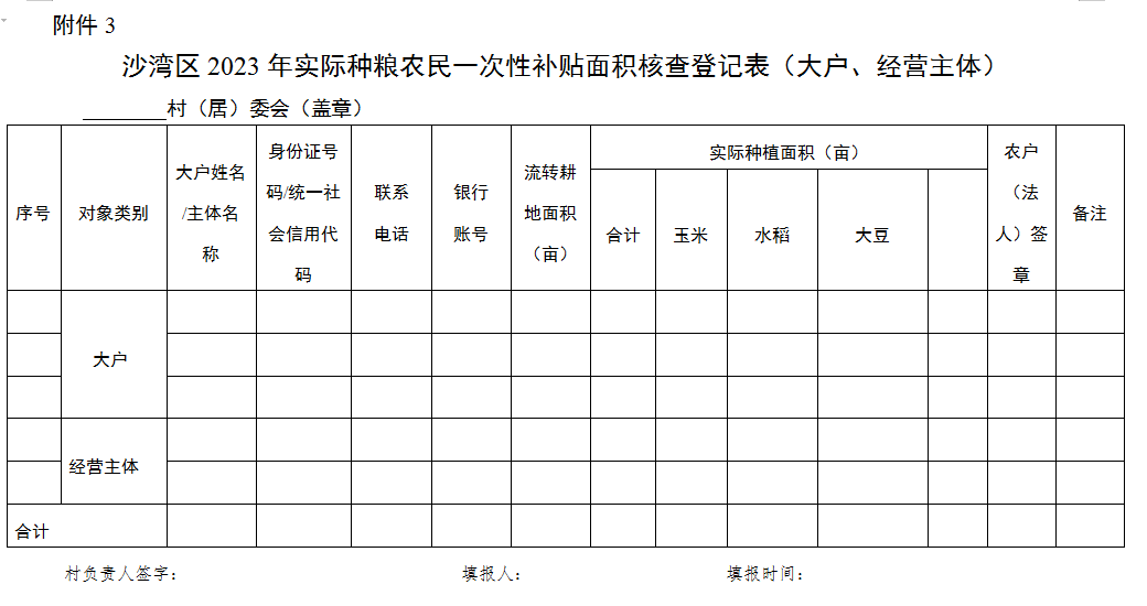 (一)基礎(chǔ)數(shù)據(jù)申報登記。各村、組在農(nóng)戶信息登記時必須準確填寫姓名、身份證號碼、手機號碼、補貼面積等內(nèi)容。普通農(nóng)戶按照附件2進行申報登記;合計種植面積超過30畝以上的種糧大戶,按照附件3格式申報登記。