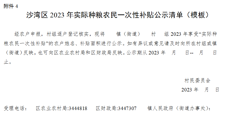 嚴格執(zhí)行補貼公示制度,由各鎮(zhèn)(街道)落實在各村委會村務(wù)公開欄上進行公示,公示責(zé)任主體均為鎮(zhèn)人民政府、街道辦事處,公示時間不少于7天。公示期間,應(yīng)當(dāng)充分聽取農(nóng)民群眾的意見,接受群眾監(jiān)督,發(fā)現(xiàn)問題及時核實糾正。區(qū)農(nóng)業(yè)農(nóng)村局、區(qū)財政局設(shè)立“實際種糧農(nóng)民一次性補貼”監(jiān)督電話,接受群眾監(jiān)督。區(qū)農(nóng)業(yè)農(nóng)村局舉報電話0833—3444818,區(qū)財政局舉報電話0833—3447307。